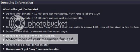 TranceTraffic — "Donations of $50 or more will upgrade your user status to VIP and allow you to download, without the worry of getting banned because of your share ratio at all for a period of 4 whole months." Additionally, if you ‘PayPal subscibe’ (monthly $10 donation), the same applies. A mere $5 gets you a donation star.